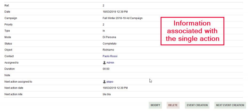 A module dedicated to advanced CRM management. It allows you to keep track of interactions with third parties and their contacts. Every sellers action towards third parties is recorded and cataloged. Any mail sent is registered and cataloged. The management of Sales campaigns is possible. Actions can generate events on the agenda. Each action can be associated to documents. Analysis and reports