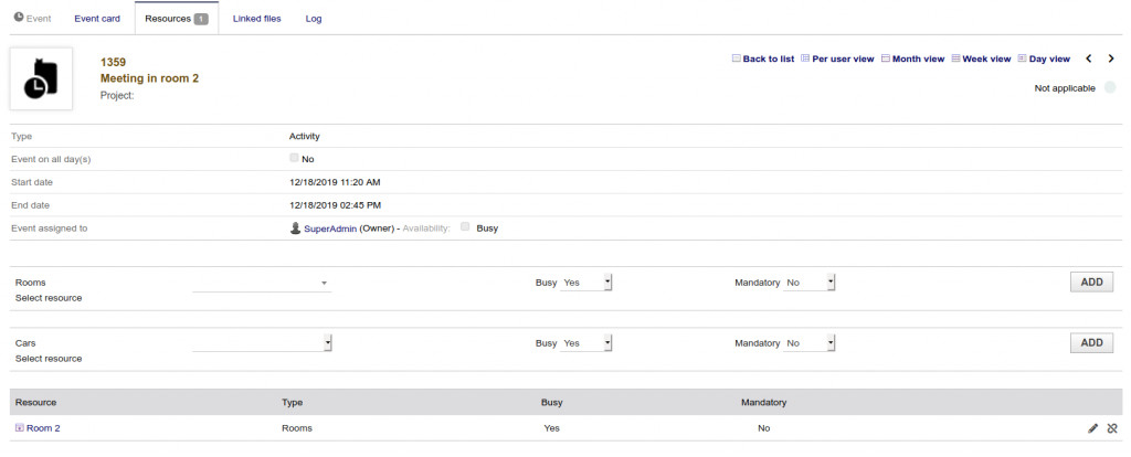 With this module you can check de availabilty of the resources. If a resource is used in the same date and hour, the action cannot be modified, or de resource cannot be added to the action. Also, in resources you can set a unit or limit number of resources that can be used at same time.