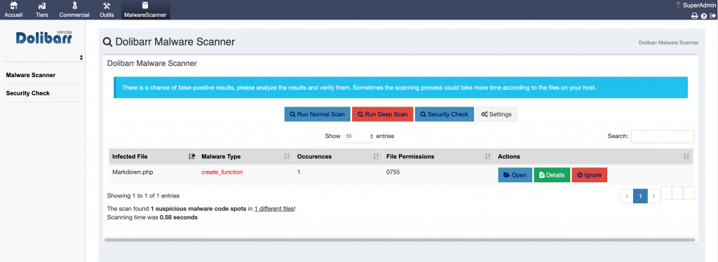 Malware Scanner vous aidera à scanner votre Dolibarr d'un simple clic. Il peut détecter des virus, des coquilles, des logiciels malveillants, des infections de code malveillant et d'autres menaces de sites Web connus et inconnus. Vous pouvez exécuter une analyse et il est également intégré à l'outil Security Check. il possède de nombreuses fonctionnalités et paramètres.