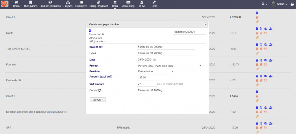 Generate Dolibarr elements (invoices, expenses reports, payments of loan...) from bank statement at .CSV format or directly from QONTO Bank API.