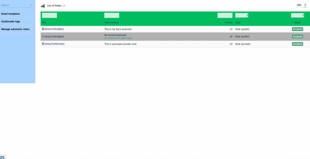 Ce module vous permet de disposer de notes pré-enregistrées que vous pouvez automatiquement ajouter à plusieurs ressources telles que les commandes, factures, expéditions et propositions commerciales.