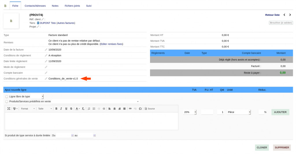 Ce module vous donne la possibilité d’ajouter vos Conditions générales de vente aux documents PDF (factures, propositions, commandes et expéditions).