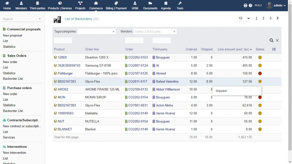 | See all backorders in " Commerce / Sales Orders / Backorder List " and/or " Commerce / Purchase Orders / Backorder List " and make a filter with category of product, supplier, ref of product and you will have a total of backorder amount. You also see a status if shippable or not. Overview of your backorders is also available in customer orders and supplier orders dashboard. |