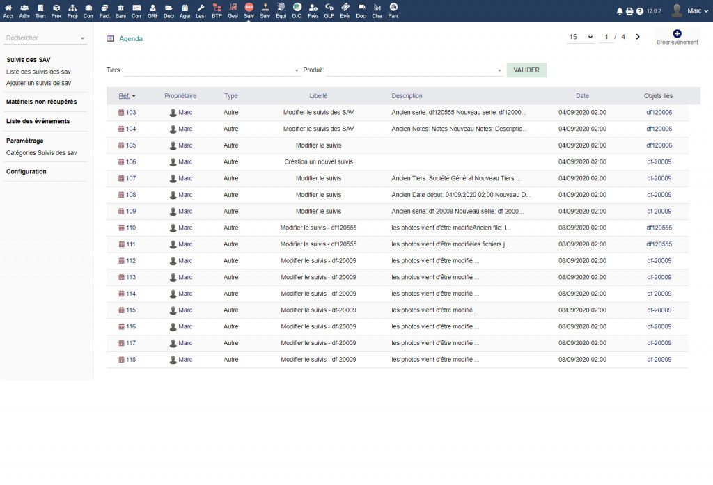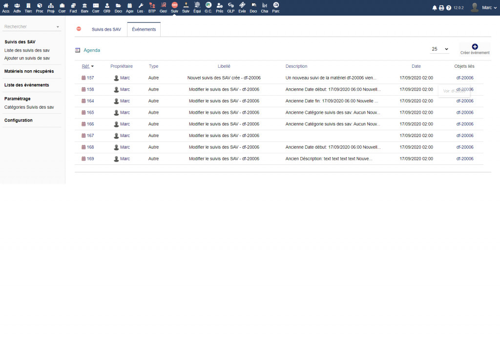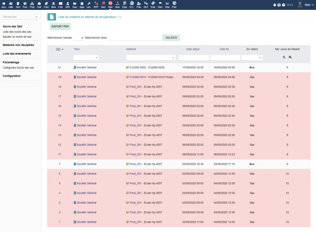 Il modulo "Follow-up del servizio post-vendita" consente di monitorare il materiale e le attrezzature dopo un'operazione di vendita o di noleggio, inserire l'elenco dei materiali o delle attrezzature, scoprire l'elenco dei materiali in attesa di recupero, consultare il storia e tracciabilità dei movimenti effettuati sull'attrezzatura, modificare un report.
