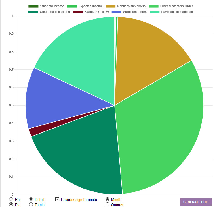 The financial planning module allows you to predict the financial availability of your company in the short and medium term, based on future data on receipts and expenses (orders and deadlines of customers / suppliers, taxes, salaries, ....) and forecast data entered manually. The results can be exported in a spreadsheet and / or analyzed with graphs.