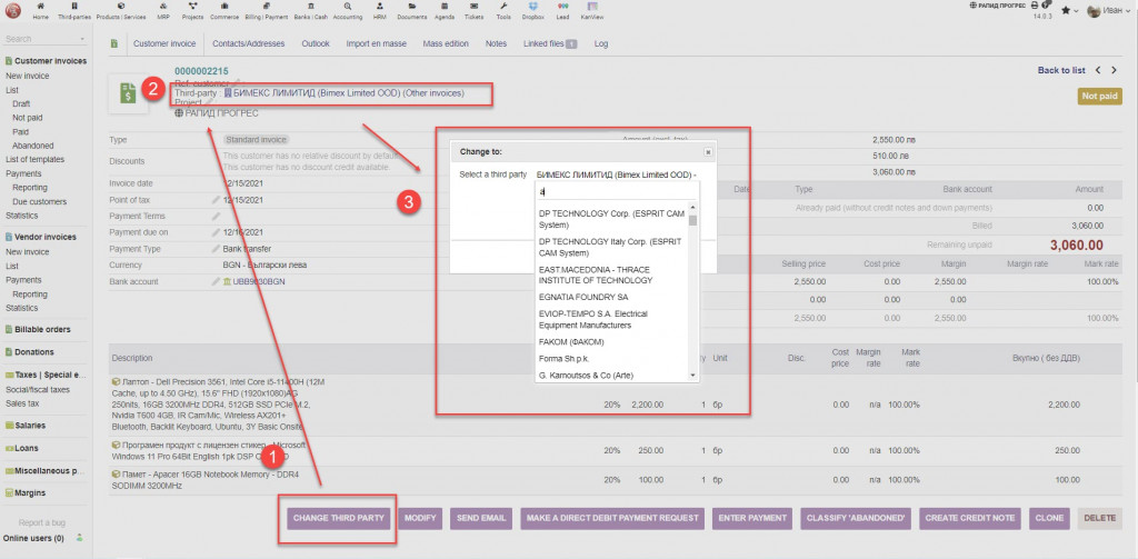 Change Thirdparty Pro Plugin adds a button and gives the possibility to change the owner, thirdparty, without changing the ref number of the document for: - Commercial proposals - Customer Orders - Vendor proposals - Purchase orders - Contracts/Subscriptions - Customer invoices - Vendor invoices