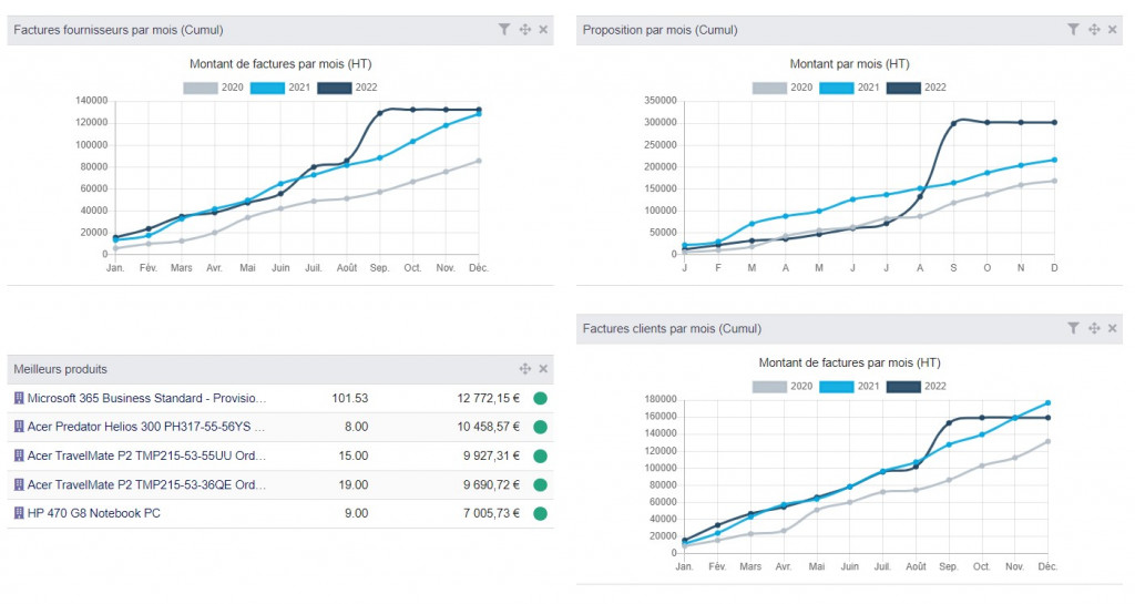 Statistiques Premium build quick graphics to help you having a quick look to your company health. Sells, Purchases, Margin, Stock... You can see a map with marker on every town when you have customers (need free MapQuest key).