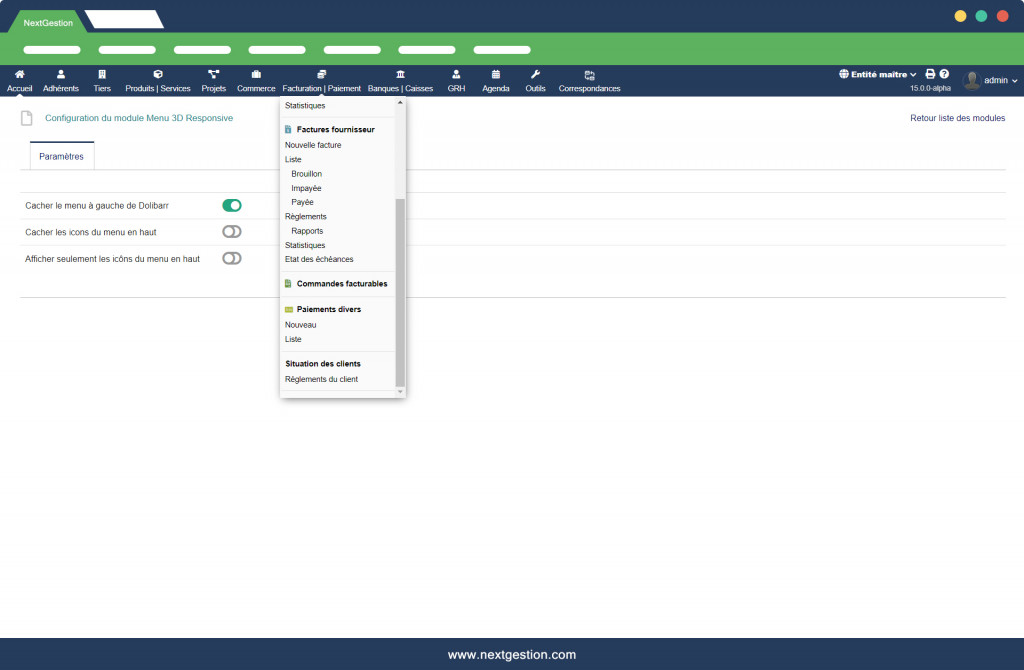 The "Responsive 3D Menu" module allows you to enlarge the working interface of your Dolibarr platform, so you can hide the menu on the left or use the new Vertical Menu at the top with the submenu as if you are browsing a site dynamic web.