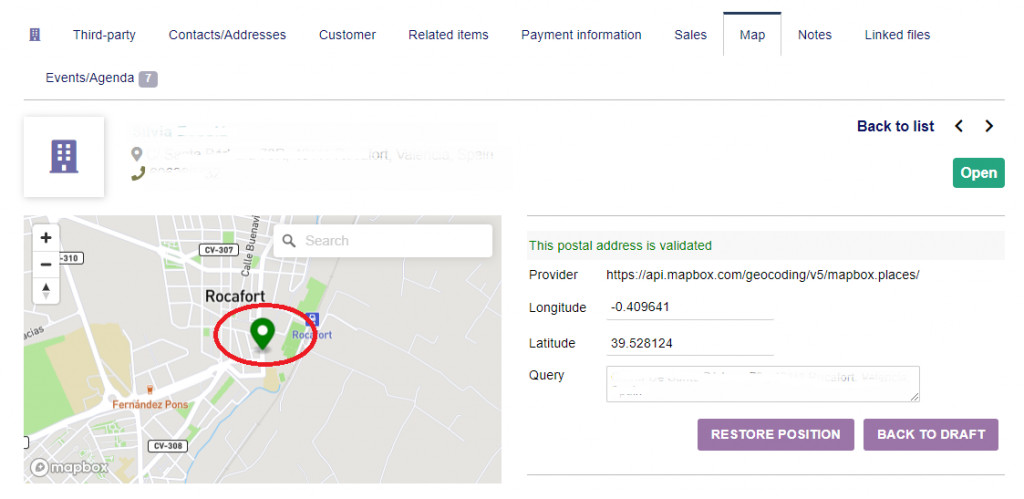 When accessing the content of this tab, the module makes a query to the mapbox address service, processing and sending the data that appears as the postal address of the Dolibarr object, and offers a tentative location on the map. At this time, a record is inserted with the geo data obtained in a "draft" state that can be visually validated by the user.