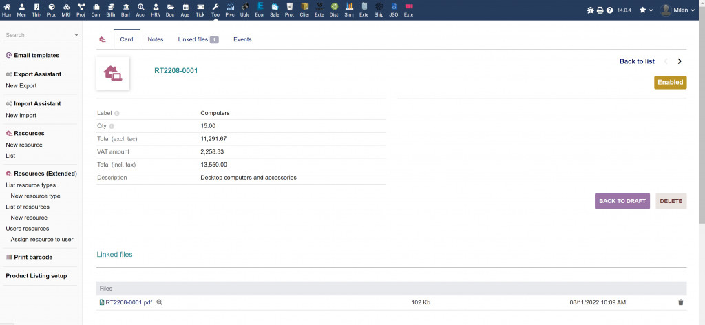 This plugin is an extended (evaluated) version of the original Resources module. It helps you manage your company resources quantity, value, distribution and EOL. You can view your resources cost (purchase value), assign them to a particular customer, track resource cost per customer etc.