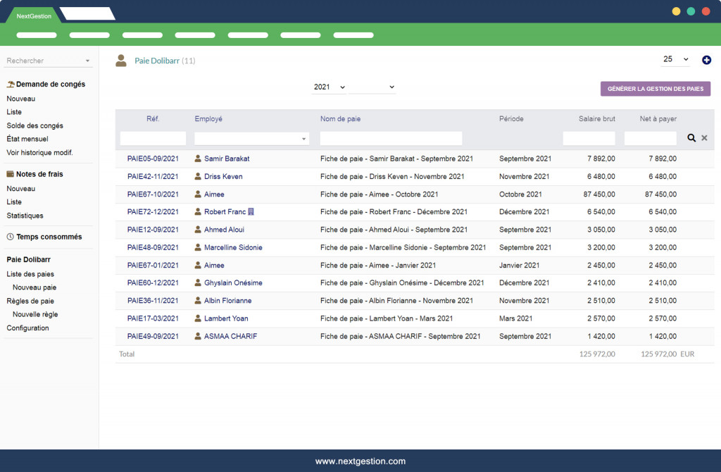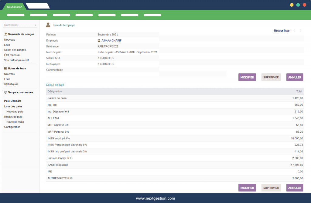 El módulo "Nómina" V4 le permite asegurar una muy buena gestión de su nómina en Dolibarr, y generar una situación de nómina (mensual o anual) para su empresa. Este módulo le permite facilitar el cálculo de: - Salario bruto - Salario neto - Y la red para pagar