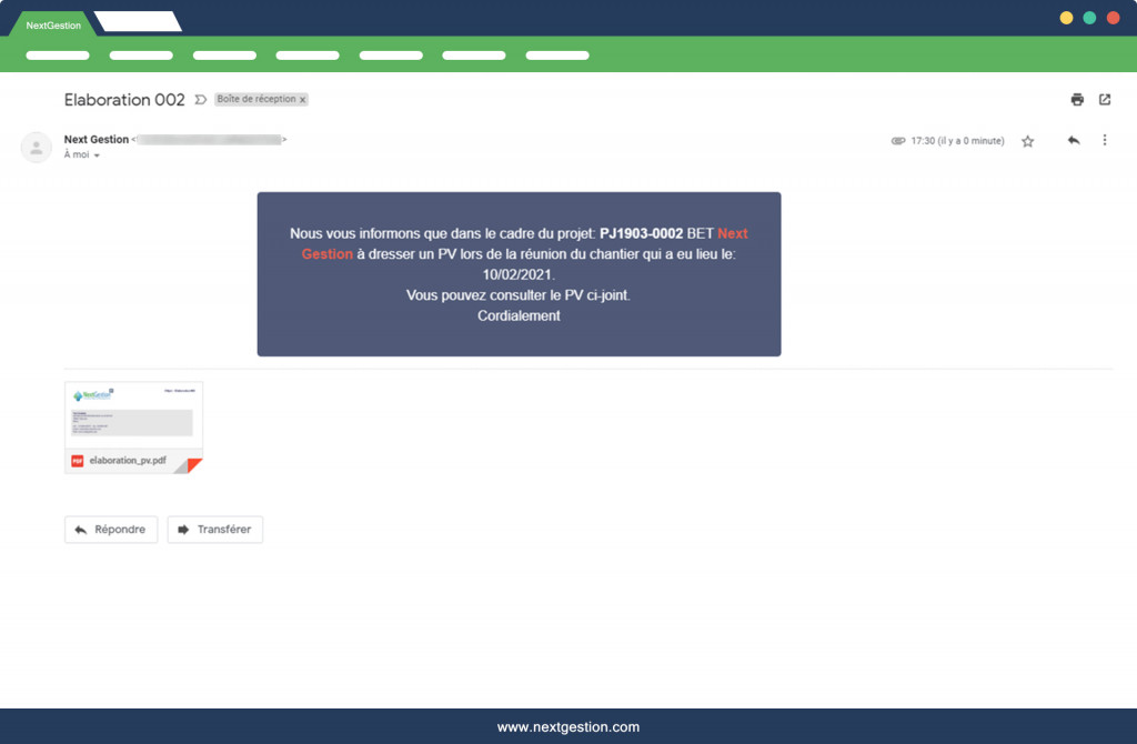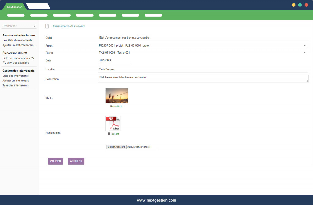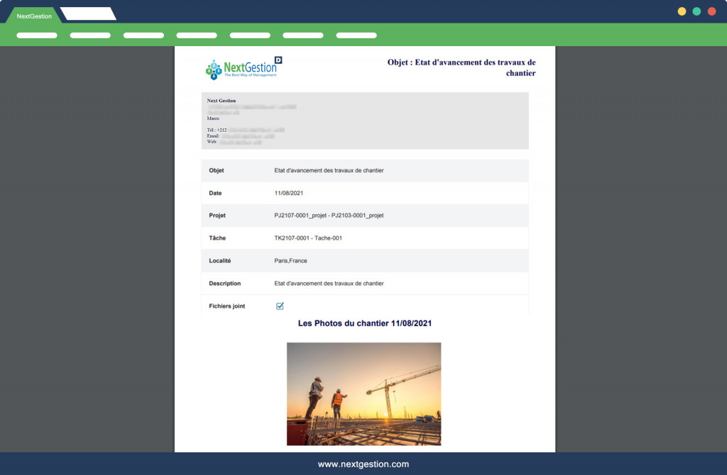 The module "Follow-up of building sites BTP" V4 allows you to: - Attach the documents and the real photos of your sites in the progress reports (minutes) - To elaborate the PV of the building sites - Enter the various stakeholders on the construction site - Edit progress reports and PV as a PDF file - The email of progress reports and PV to the various stakeholders on the construction site