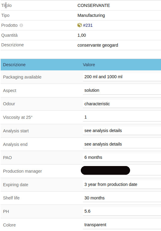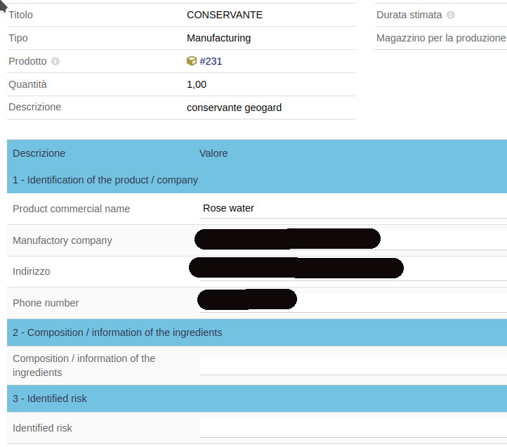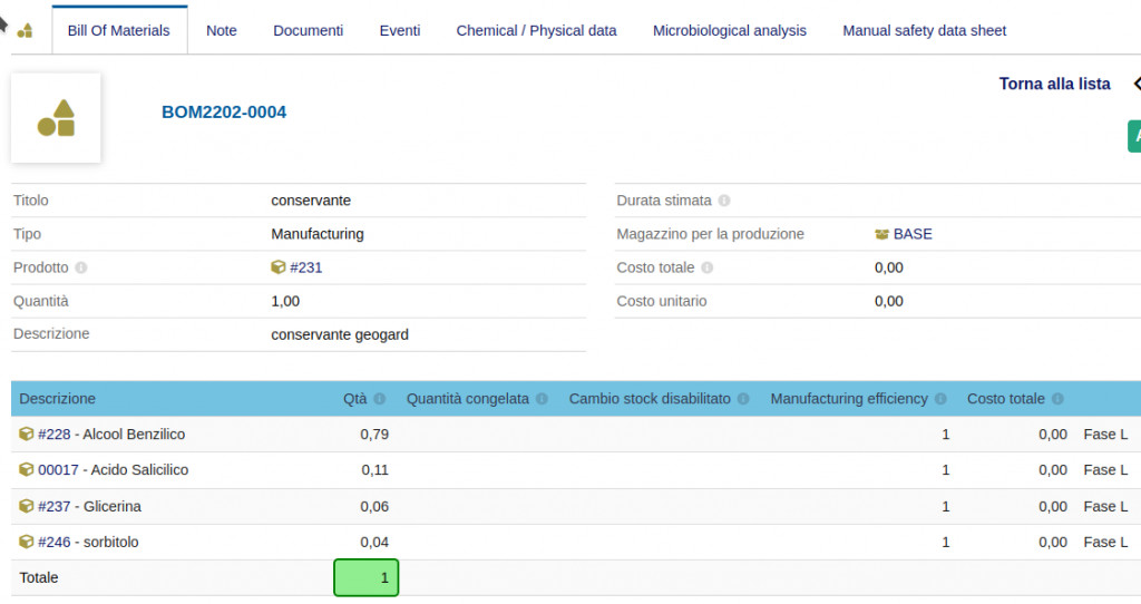 The Chemical Formulary module aims to create. memorize and produce chemical formulas for products to be marketing by correctly maintaining the stocks of the products used and printing reports to be presented to the competent authorities for marketing or export. These formulas are composed of ingredients and components which mixed with regard to the processing phase and complete with explanatory notes give rise to the product to be marketing.