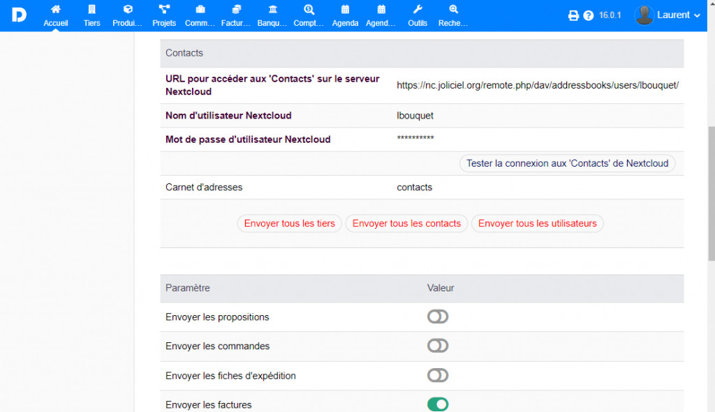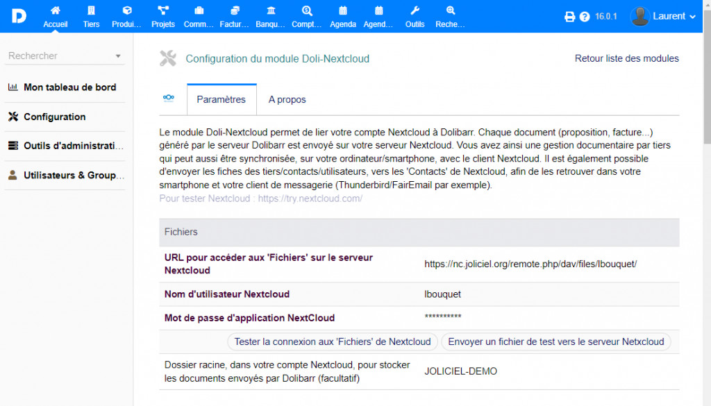 Lier votre compte Nextcloud à Dolibarr. Chaque document généré par Dolibarr est envoyé sur votre serveur Nextcloud. Il est également possible d'envoyer les fiches des tiers/contacts/utilisateurs, vers les 'Contacts' de Nextcloud. IMPORTANT : Accès illimité aux mises à jour Support technique : dolibarr@joliciel.fr Démo