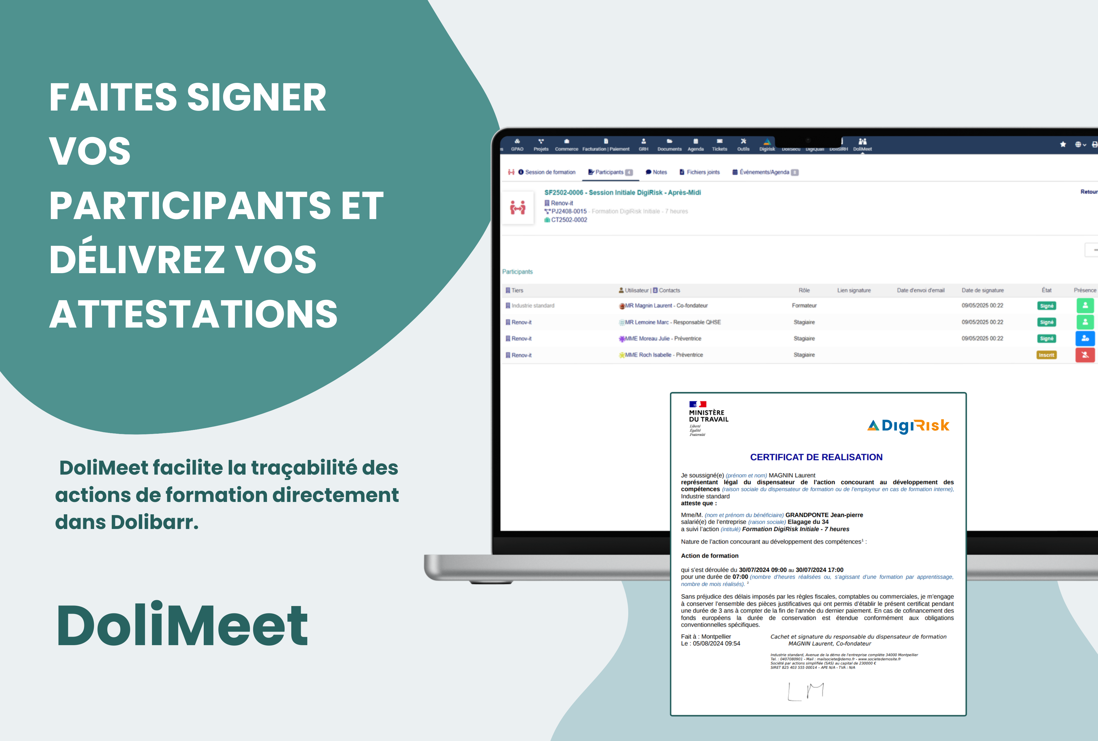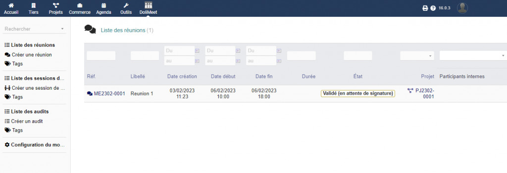 DoliMeet allows you to track down: meetings and minutes of the meeting, training sessions with certificates of attendance and certification of achievement, audits with the report