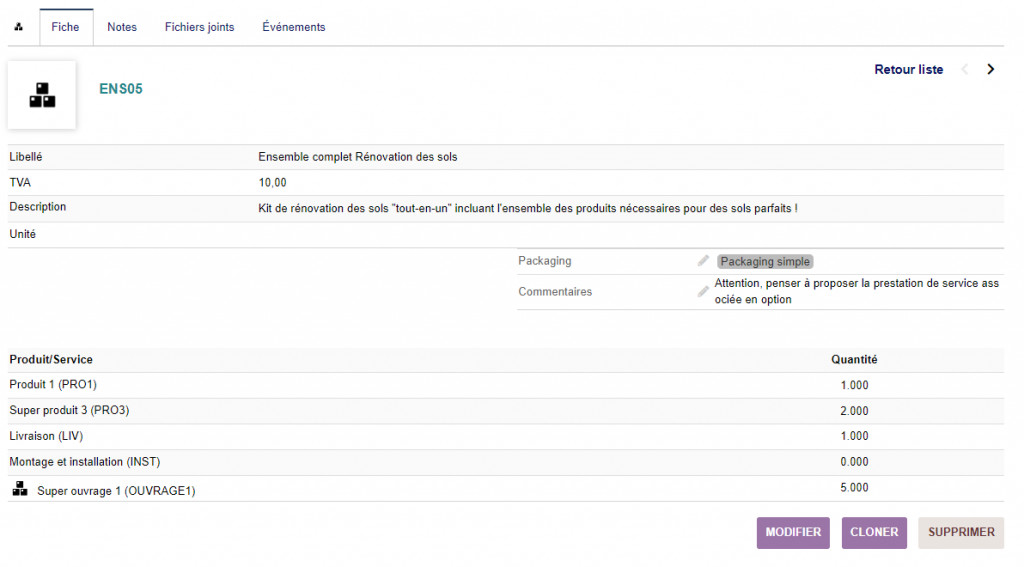 Simply create, register and use packages that combine multiple products and / or services. Save valuable time: add (and modify if necessary) in one click your package of products / services in proposals, orders, invoices, ... Module compatible with Multilanguage Dolibarr