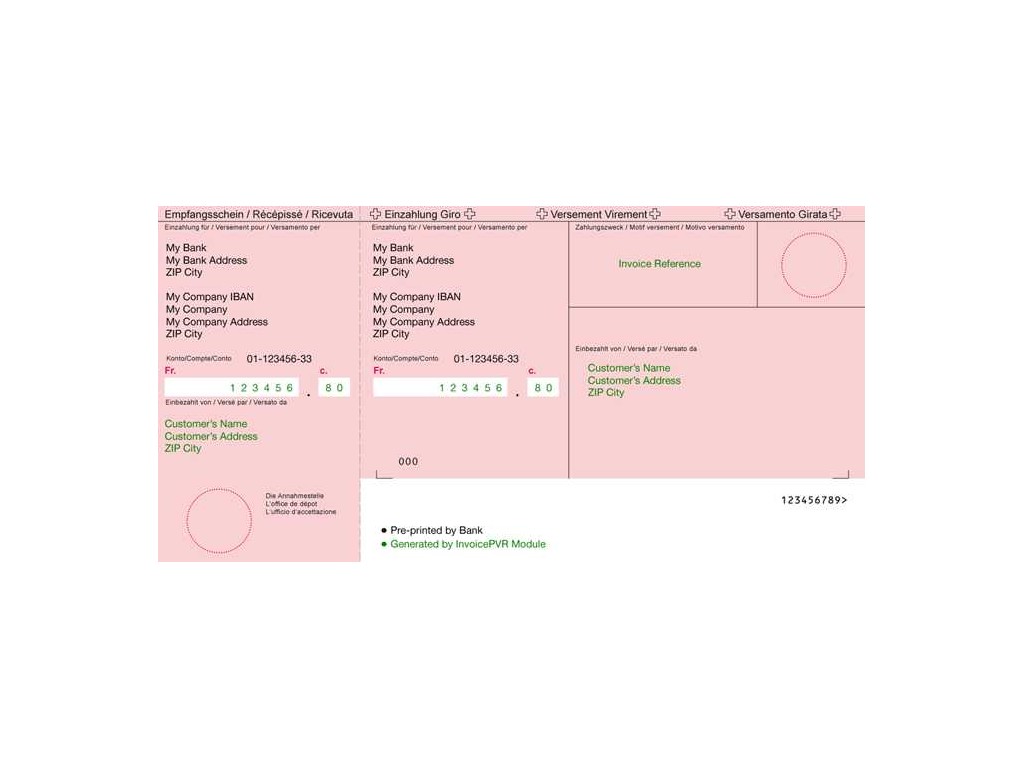 Génération PDF de: (EN) IS : Red Inpayment Slip (IT) PV : Polizza di Versamento rossa (DE) ES : Roter Einzahlungsschein (FR) BV : Bulletin de Versement rouges (EN) ISR : Orange Inpayment Slip with Reference number (IT) PVR : Polizza di Versamento arancione con numero di Riferimento (DE) ESR : Oranger Einzahlungsschein mit Referenznummer (FR) BVR : Bulletin de Versement orange avec numéro Réf