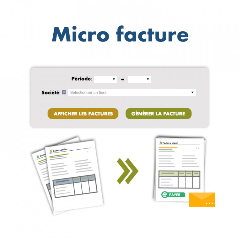 Módulo “Micro Factura” para Dolibarr: Gestión Simplificada de Facturas de Clientes El módulo "Micro Factura" es una solución empresarial personalizada diseñada para satisfacer las necesidades específicas de su cliente en términos de gestión de facturas. Simplifica el proceso de creación de facturas al permitir al usuario ingresar información sobre los productos vendidos diariamente. Características clave: Parte 1: Ingresar información del producto Producto: Seleccionar el producto del listado de productos registrados en Dolibarr, asegurando así consistencia y precisión en la selección de productos. Parte 2: Situaciones del cliente: facturación mensual simplificada Mes: Seleccione el mes que desea facturar, lo que permite agrupar las transacciones mensualmente. El módulo “Micro Factura” ofrece varias opciones de pago para facilitar el pago por parte de los clientes: Tarjeta de crédito El módulo “Micro Factura” simplifica la gestión de las facturas de los clientes automatizando el proceso de cálculo y ofreciendo varias opciones de pago. También permite consolidar las transacciones mensuales para una facturación más eficiente. Esta solución a medida satisface las necesidades específicas de su cliente y mejora la gestión de su proceso de facturación. Módulo “Micro Factura” para Dolibarr: Gestión Simplificada de Facturas de Clientes
