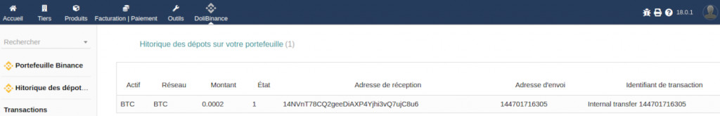 DoliBinance is a simple module to add capability to accept Bitcoin or other crypto allowed by Binance, on Dolibarr. The payment page display your wallet deposit address (set it with the dictionnary) to the customer and a form to allow him to enter the transaction data he made to paid the invoice (by blockchain direct payment or exchange,...).