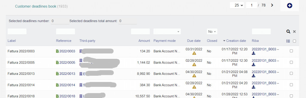 The Deadlines module adds a set of useful features for managing customer/supplier payments. The main feature of the module is that it allows management of payment terms over multiple expiry periods, being able to define payments such as 30/60/90 days end of month or other similar formats .