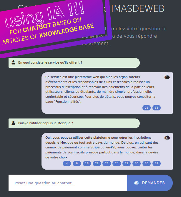 1. Puedes crear ilimitados chatbots, para insertar en cualquier web: se configura cada chatbot para que busque información en las categorías de artículos de la base de conocimiento que tú prefieras, puedes personalizar el mensaje de inicio, el "system prompt", el color de acento y luego insertar un código HTML/Javascript que el sistema te da para que aparezca la típica burbuja clicable en una esquina de la página web que tú quieras.