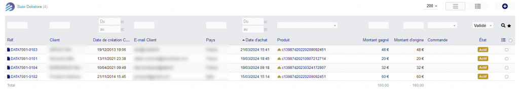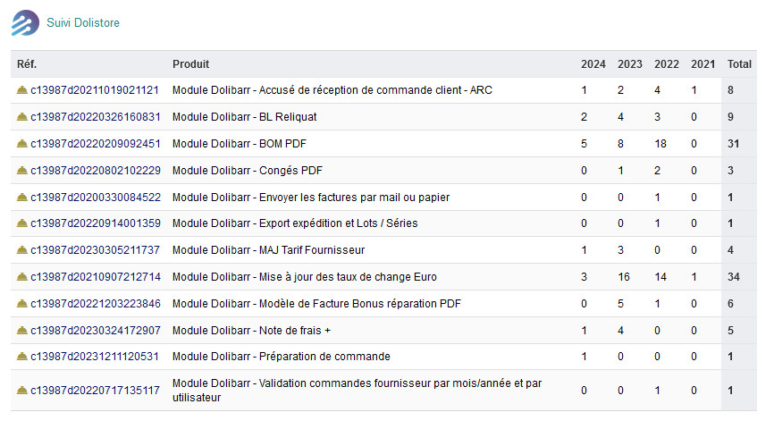 Le module Suivi Dolistore permet de suivre ces ventes faites sur le Dolistore dans Dolibarr. Avec ce module vous pouvez importer vos ventes et préparer la commande puis la facture que vous allez envoyer l’association Dolibarr pour obtenir le règlement de vos ventes. Il permet également de connaitre le nombre de vente de chaque module sur 4 ans.