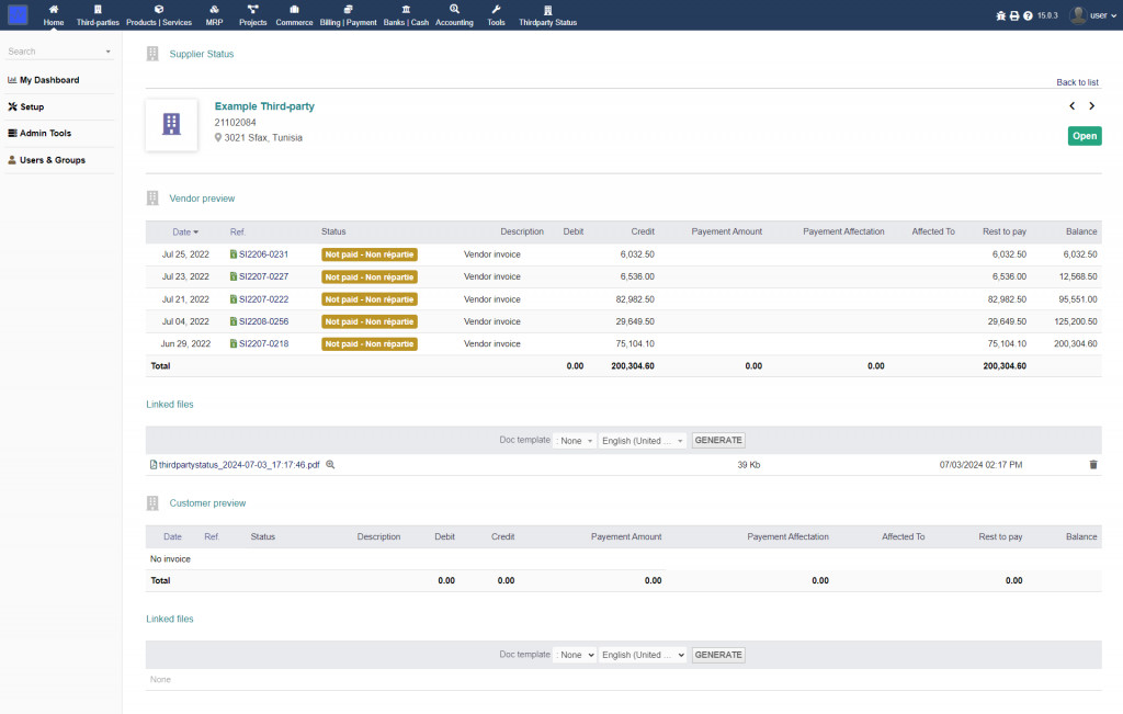 A module that shows the finance situation for each thirdparty and make a printable version of it