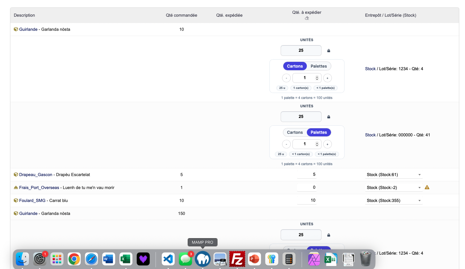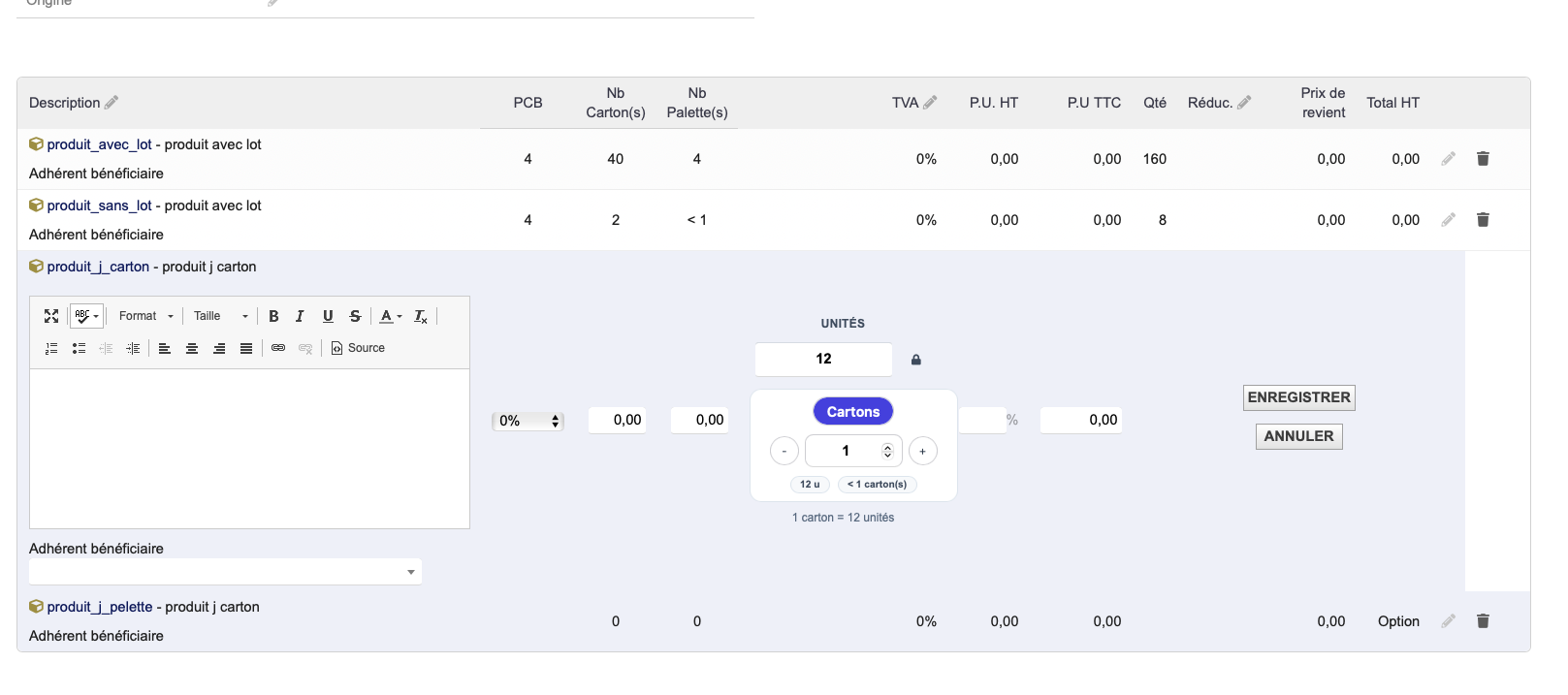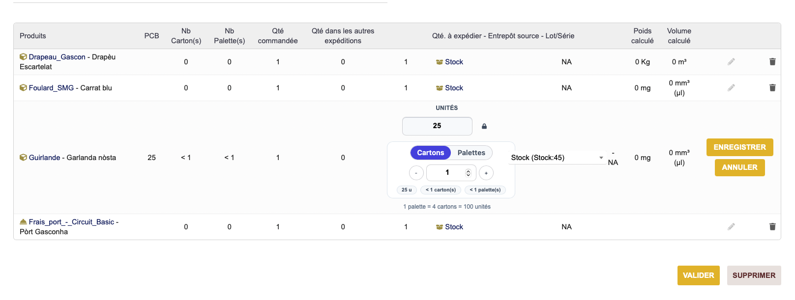 Le module permet de saisir les quantités en unités, cartons ou palettes, selon les préférences des clients. Lors de la saisie en unités, Condilogix arrondit automatiquement la quantité au carton ou à la palette supérieure, garantissant une gestion de stock précise tout en évitant les erreurs de commandes, de factures ou d’expéditions.