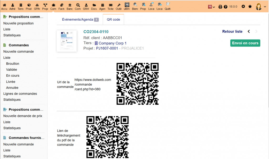 Adds a QRcode tab to the Third Party Cards, Products/Services, Members, Orders, Intervention, Stock, in which a QRcode will be created on the fly.