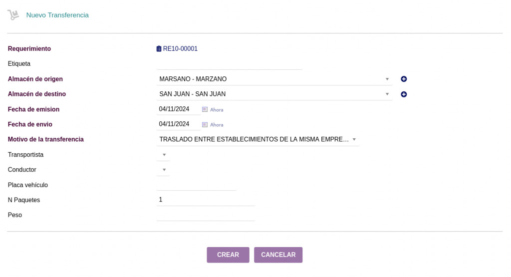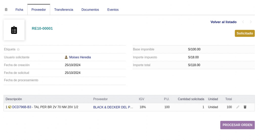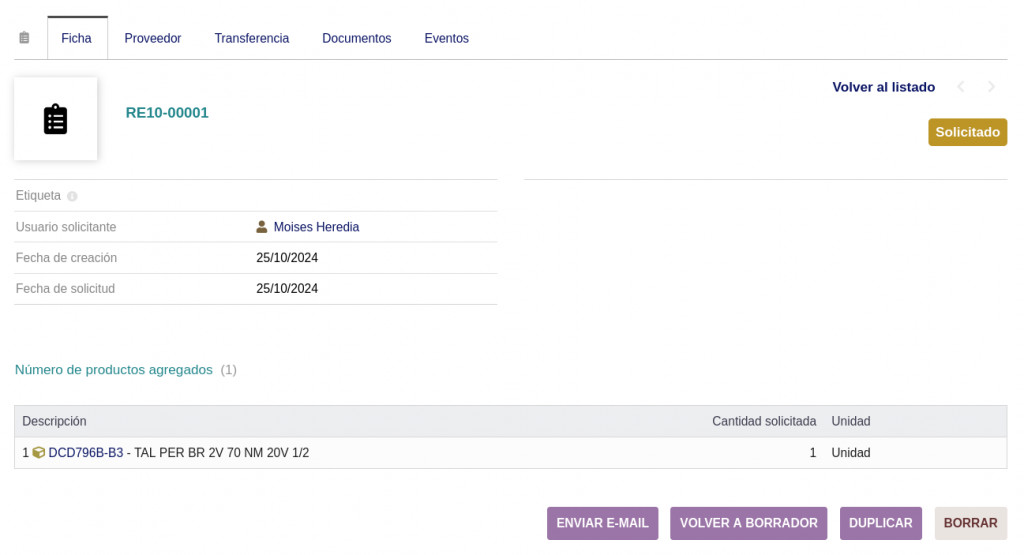 Allows users to request product requirements, this requirement can be processed in a purchase order or a transfer between warehouses.