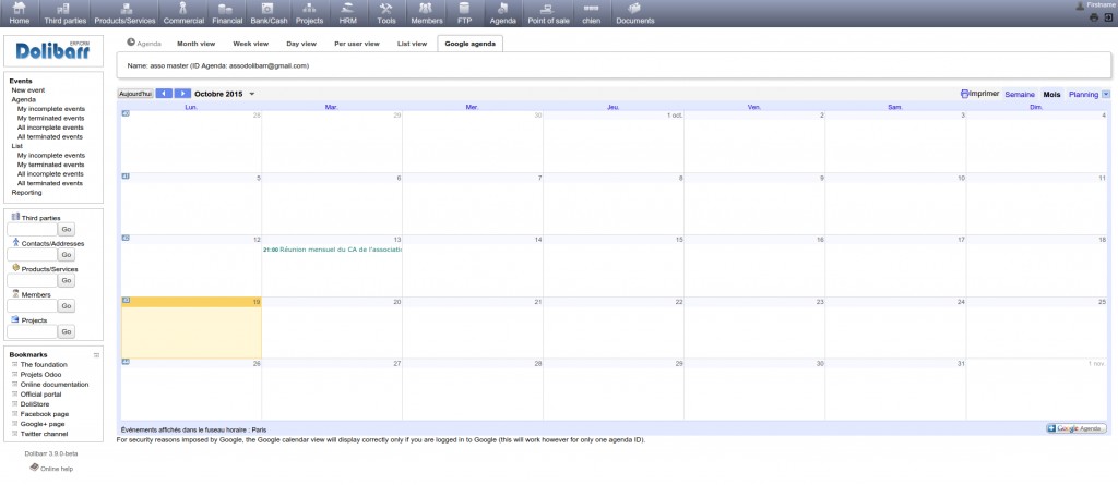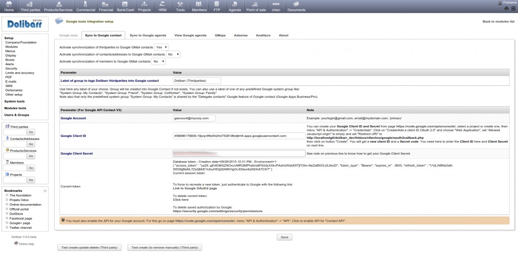 Intègre ou synchronise Google Calendar, Google Contact, Google Maps, Google Analytics et Google Adsense dans votre Dolibarr : Peut synchroniser les événements, les tiers, les contacts avec google, visualise les adresses dans Google Maps, ou la répartition des tiers, contacts ou adhérents, ... Fonctionne avec GMail ou Google Apps for Works.
