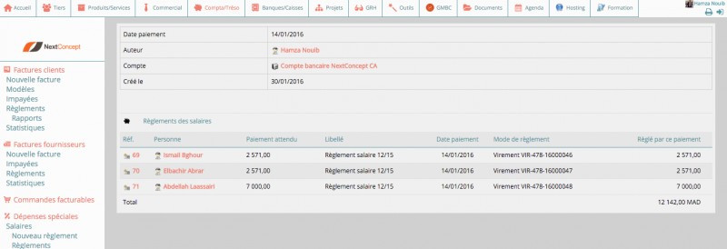 - Generar la orden de transferencia en formato PDF para uno o más empleados de la empresa antes de enviarla a su banco, - Generar en formato PDF la nómina de cada empleado. - La posibilidad de editar los números de órdenes de transferencia establecidos por el banco. If you order our module you benefit from: