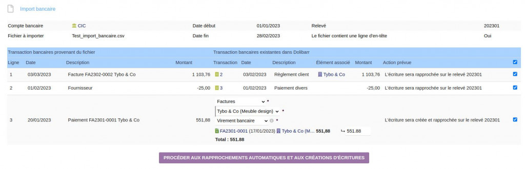 Gain de temps assuré ! Téléchargez votre relevé sur le site de votre banque et importez-le grâce au module. Après comparaison entre les écritures Dolibarr et celles de votre relevé, le module réalise les rapprochements automatiquement. S'il manque une écriture, cette nouvelle version vous permet de créer les règlements en vous proposant de rechercher la pièce concernée.
