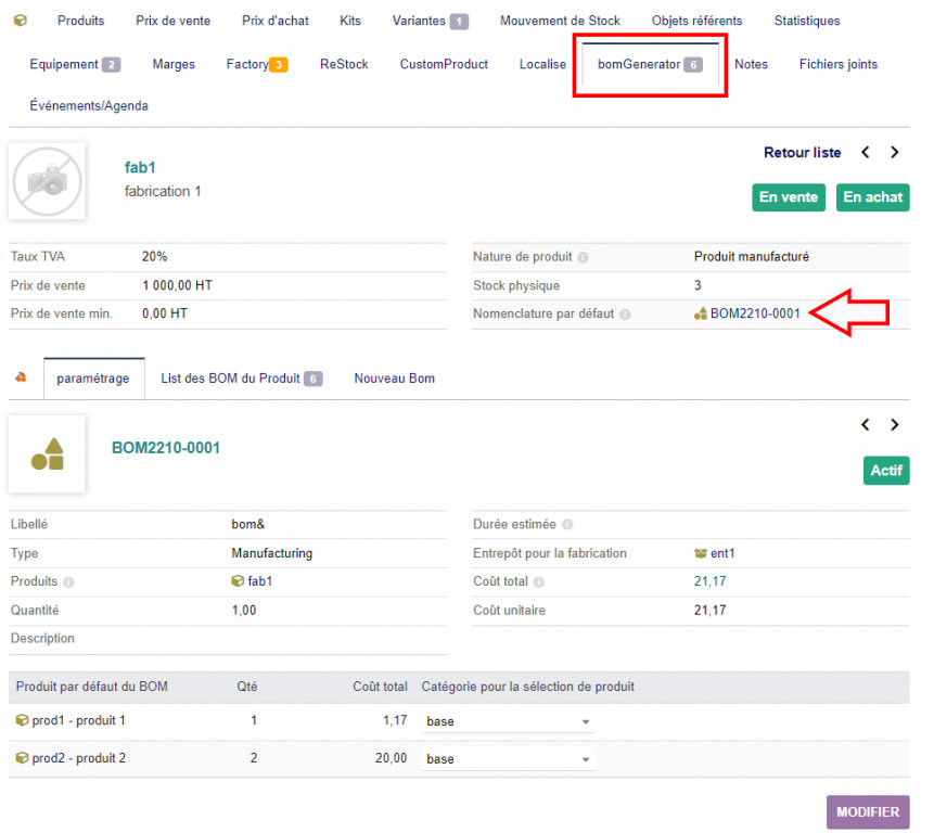A new "BomGenerator" tab has been added to the product sheet, displaying the default BOM associated with the product and allowing the management of alternative product categories.