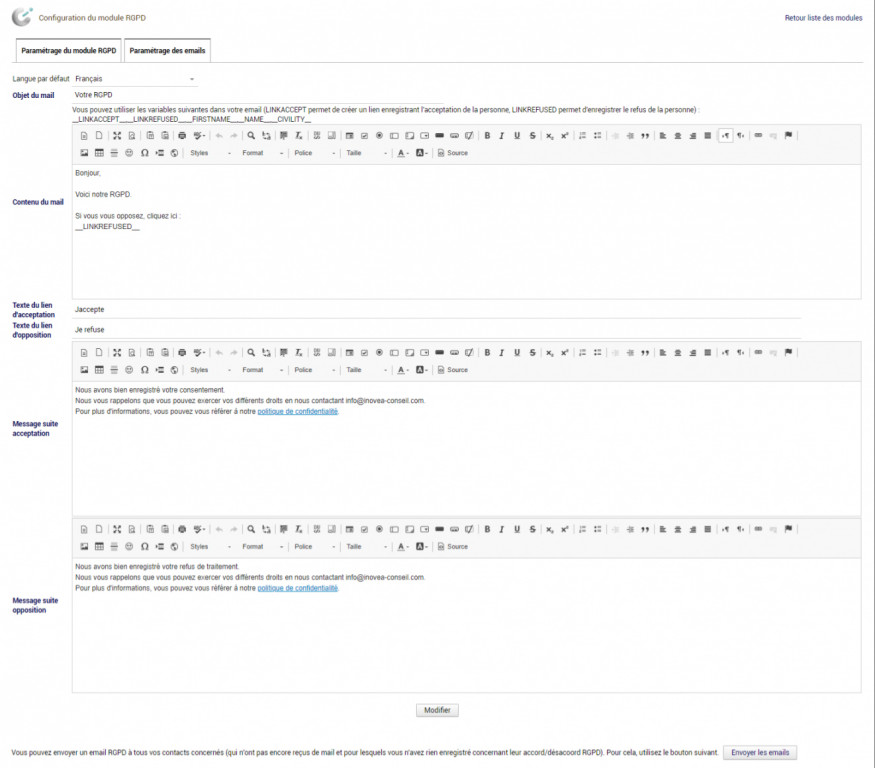 Be compliant with the new European regulation on the management of personal data (GDPR). This module adds the necessary functionalities to your Dolibarr to meet the requirements of the GDPR (right of opposition, right to forget, portability, shelf life, ...).