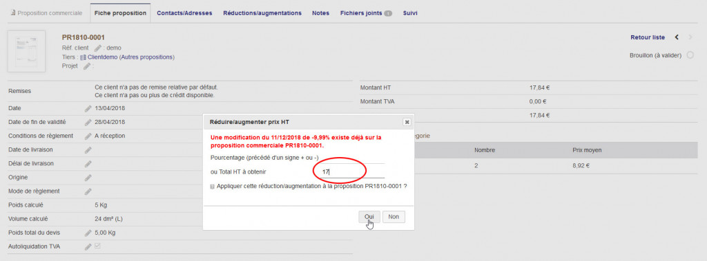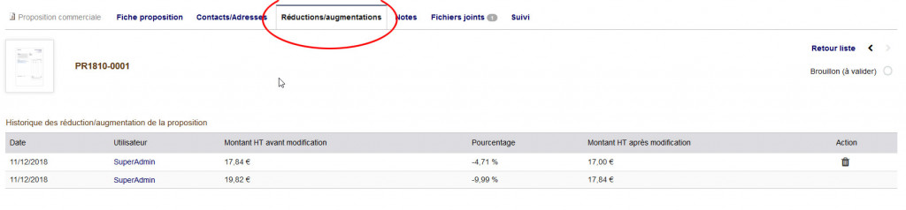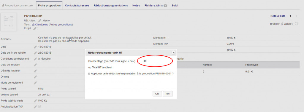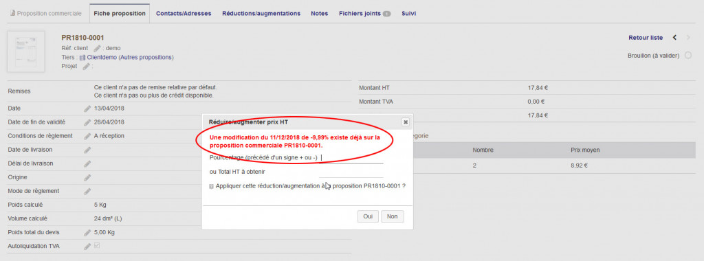 • The dolibarr module Reduction / global increase on quotation allows to apply a percentage up or down, in a global way on an estimate.