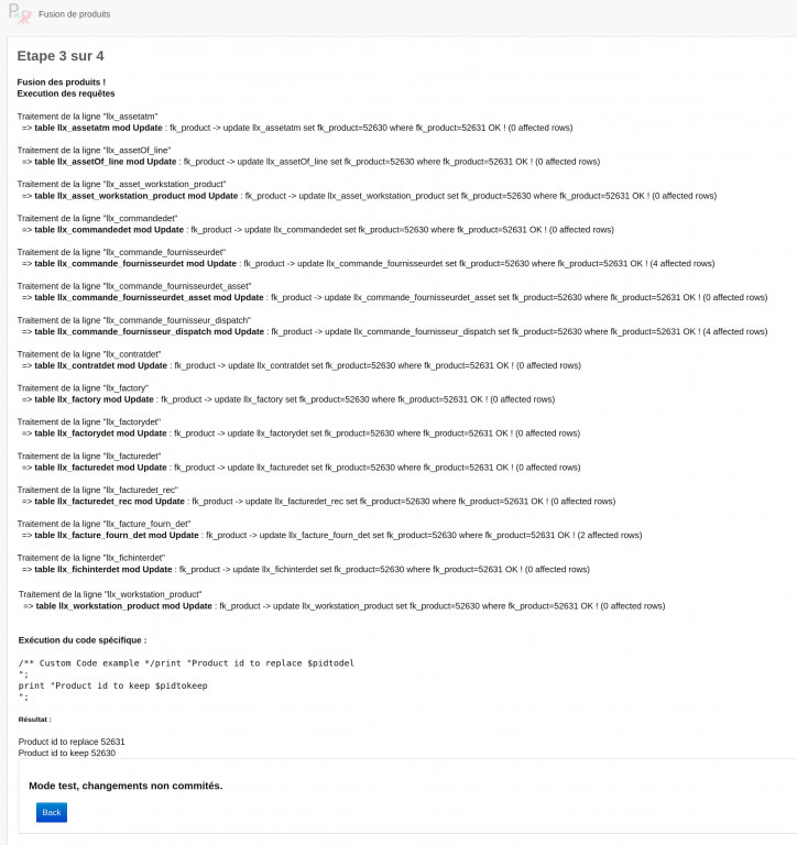 This module allows 2 products/services to be merged. You can test all queries before commit changes You can add some specific php code to be executed during the merge