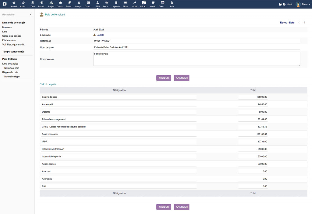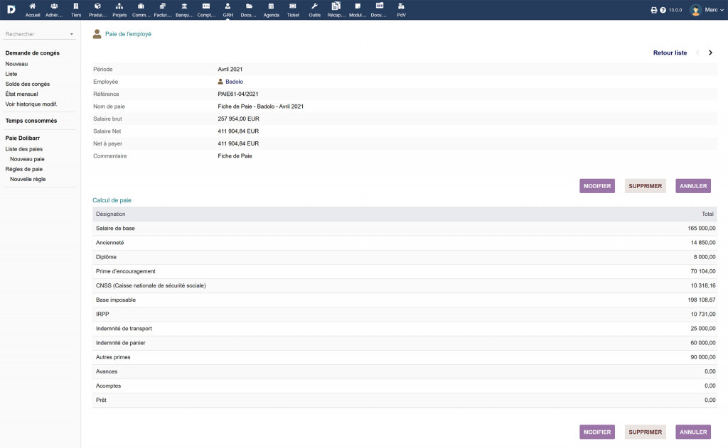 Il modulo "Payroll" ti permette di garantire un'ottima gestione della tua busta paga su Dolibarr, e di generare una situazione paghe (mensile o annuale) per la tua azienda. Questo modulo consente di facilitare il calcolo di: Questo modulo ti permette anche di inserire i valori per la configurazione del modulo Payroll e di generarlo dalla tua situazione payroll su Dolibarr, ovvero: