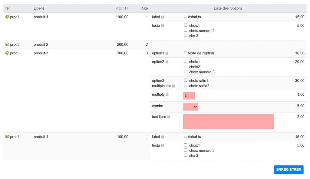 This module allows you to create customizable product options: - define your own options for each product - associate an additional amount for each of the options - the selling price of the product is automatically modified according to the options - transfer the options chosen between the parts (estimate, order, invoice)