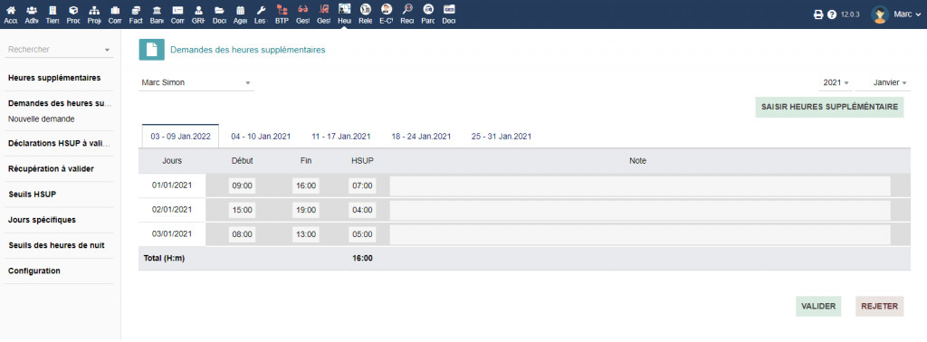 Calculez facilement les heures supplémentaires...100% d'efficacité ! ✓ Seuils heures supplémentaires et durée hebdo de travail ✓ Déclaration des heures de travail et validation Manager ✓ Calcul automatique des heures supplémentaires ✓ Compteur récupération des heures ou rémunération