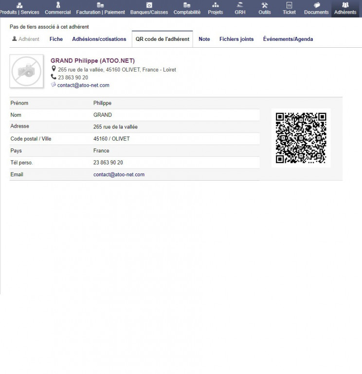 Adds a QRcode tab to the Third Party Cards, Products/Services, Members, Orders, Intervention, Stock, in which a QRcode will be created on the fly.