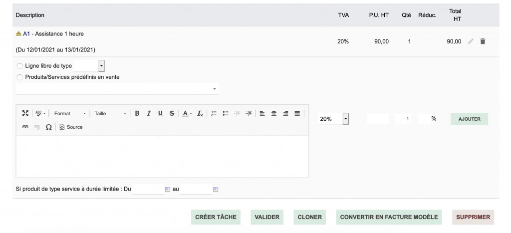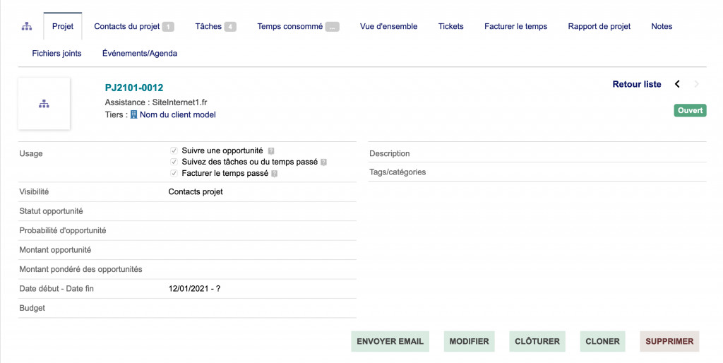 Doliproject est un module Dolibarr facilitant la gestion de temps à passer et de temps consommé. À l'activation de ce module, vous pourrez alors créer automatiquement les tâches de SAV liées à une facturation modèle. Les tâches (temps à passer) sont créées automatiquement lors de la validation d'une facture, il suffit ensuite de pointer le temps via le système de tickets.