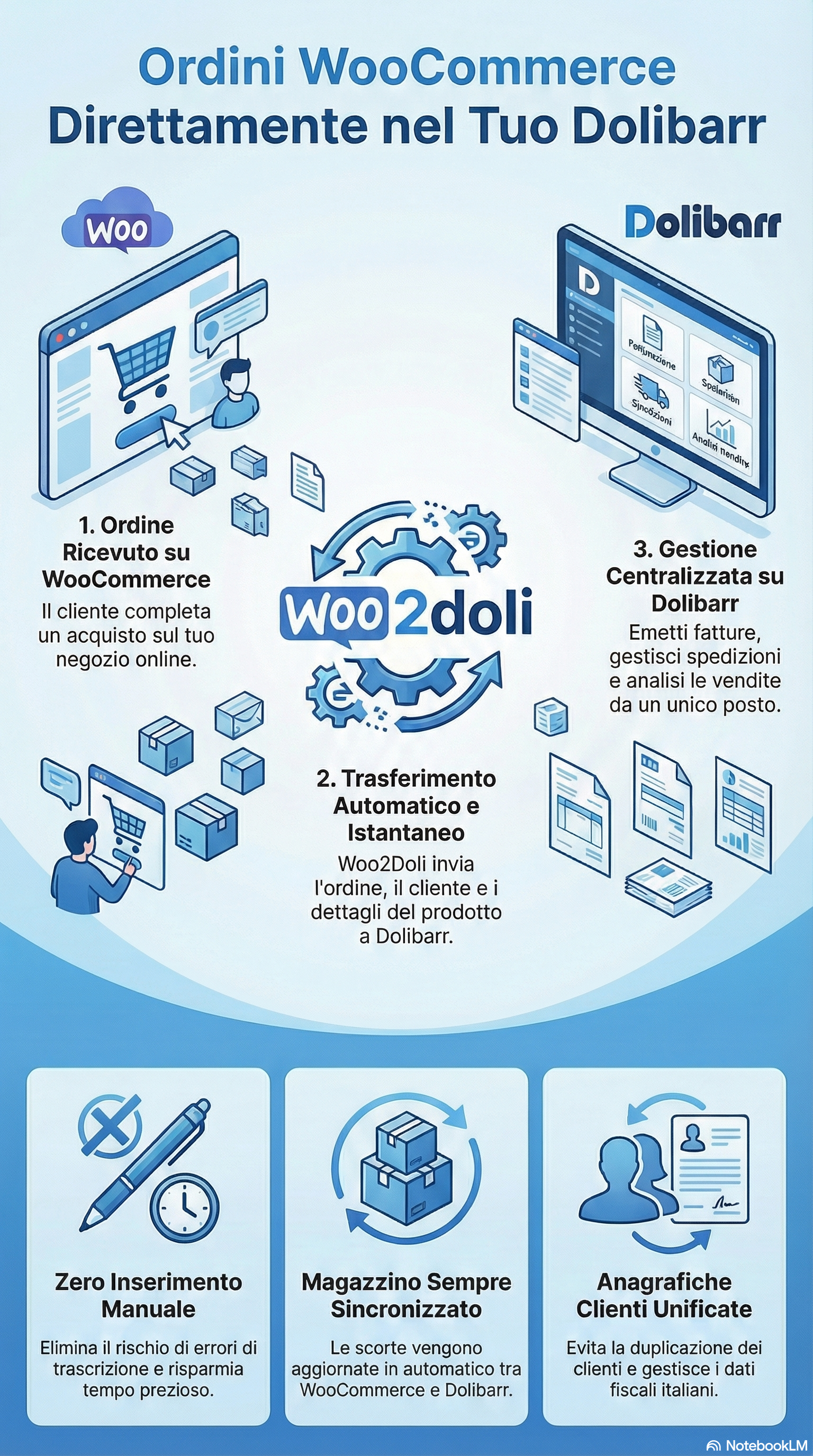 The woo2doli plugin is compatible with the Dolibarr multicompany module The woo2doli plugin is compatible with the most used language translator on woocommerce, WPML. (multilingual wordpress) Once the coupling operations between products and customers already existing in the platforms have been carried out, the functioning of the module is completely automatic, every product that is created on wordpress will be copied to dolibarr and every customer who makes a registration on wordpress will be transferred to dolibarr, of course the orders collected by woocommerce will also be transferred to dolibarr. In the event of a malfunction with the failure to transfer the order to Dolibarr, the plugin notifies the commerce admin via an email and a notice on the order page on Woocommerce.