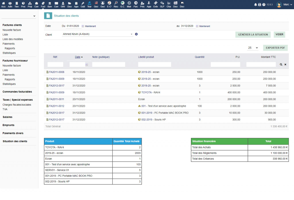 Module "Situation / Client" vous permets de connaître la situation d'un client avec le détails sur une période des produits consommés avec leurs quantités pour chaque facture aussi au bas du tableau avoir le Total Facturé de ces Achats - le Total de ces Paiement - les Quantité de produits Achetés- Le Total de ses Créances.