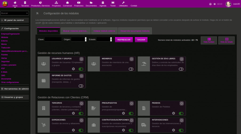DARK theme for Dolibarr 12.x, created from Eldy and MD, taking the MD flat icons of MD that have been adapted one by one to look good on a dark background. It has also been possible to obscure the appearance of external libraries such as CKE Editor, UI Datepicker widget, etc. Optionally you can buy DARK IMASDEWEB X which is a pack multiversion.