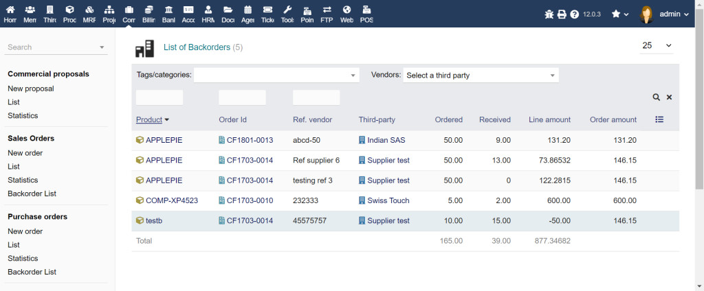 | Vedere tutti gli ordini arretrati in " Commercio / Ordini di vendita / Backorder List " e/o " Commercio / Ordini d'acquisto / Backorder List " e fare un filtro con categoria di prodotto, fornitore, rif. di prodotto e si avrà un totale dell'importo dell'ordine arretrato. Si vede anche uno stato se spedibile o no. La panoramica dei vostri ordini arretrati è disponibile anche nel cruscotto degli ordini dei clienti e degli ordini dei fornitori. |