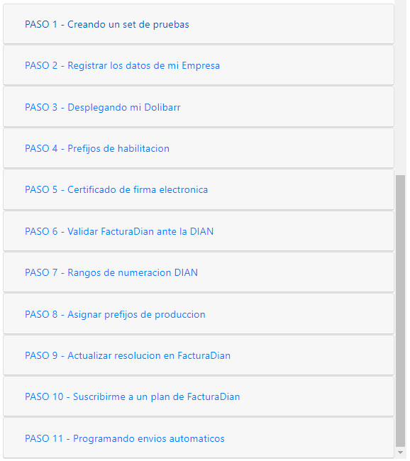 Conectar Dolibarr con la DIAN, cargar documentos, hacer las validaciones, generar los xml, enviar por correo a tus clientes y cargar la aceptación o repudio del cliente, programar los envíos a la DIAN por tipo de documento días y horas, debes realizar todos los pasos que indica el modulo para su perfecta ejecución. https://www.facturadian.com/ https://portal.facturadian.com/
