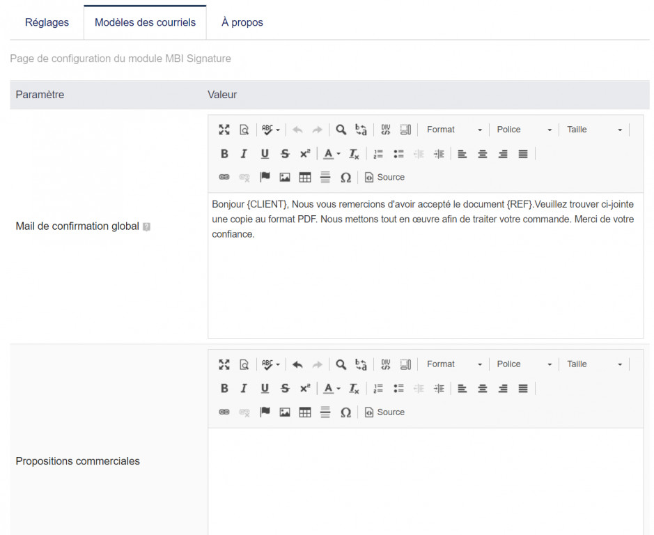 - After signing a document, an e-mail is automatically sent to your company or to the sales representative of the customer with the customer in copy. He confirms the signing and sends the signed PDF as an attachment. You can customize this e-mail in the module setup page. The commercial proposal change automatically to ‘signed’ after that.