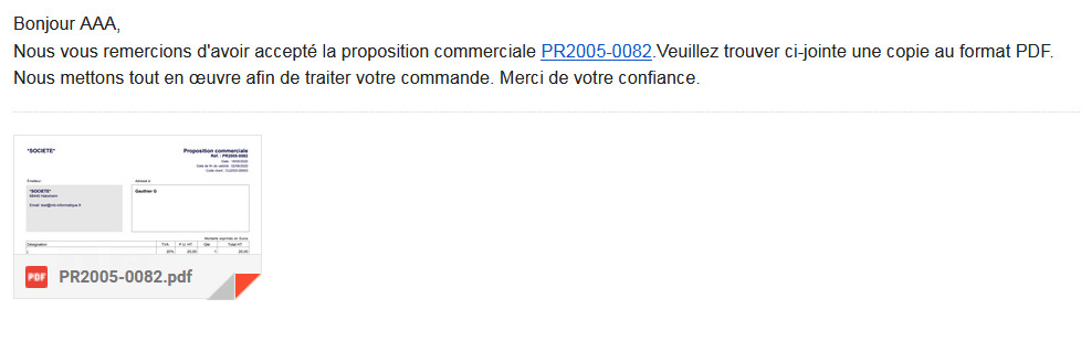 - After signing a document, an e-mail is automatically sent to your company or to the sales representative of the customer with the customer in copy. He confirms the signing and sends the signed PDF as an attachment. You can customize this e-mail in the module setup page. The commercial proposal change automatically to ‘signed’ after that.