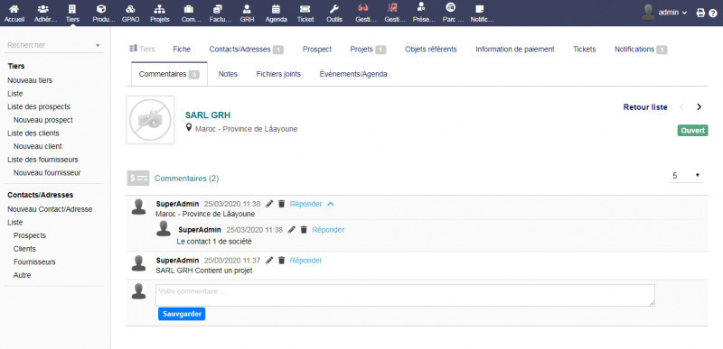 Mit dem Modul "Benachrichtigungen und Kommentare" können Sie automatisch Benachrichtigungen über Informationen zu allen grundlegenden Aktionen für Projekte, Mitglieder, Unternehmen, Dritte, Produkte, Projekte, Rechnungen und kommerzielle Vorschläge sowie für jedes Element erstellen von Dolibarr haben wir für jedes Modul zwei Registerkarten "Benachrichtigung" und "Kommentare" hinzugefügt.